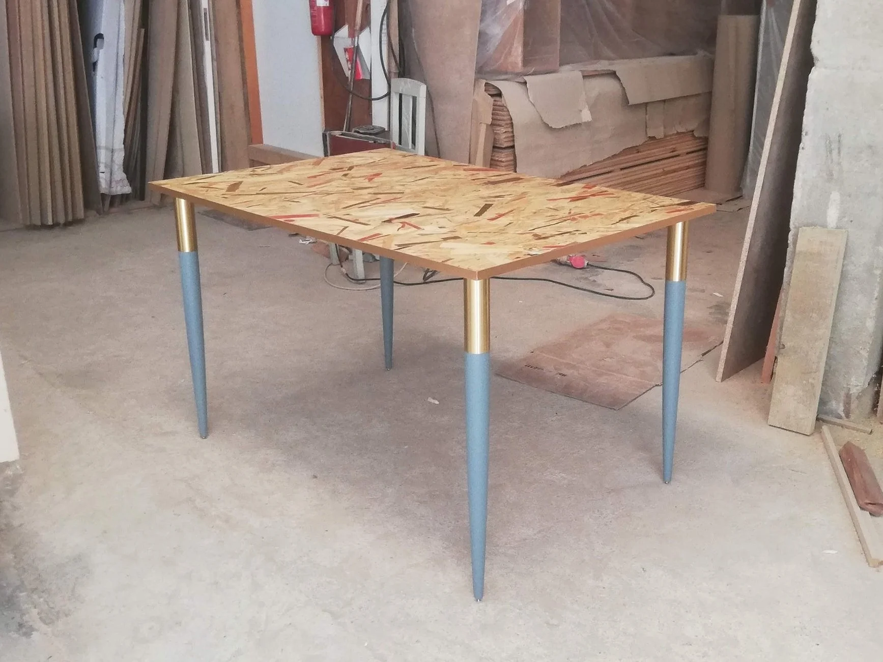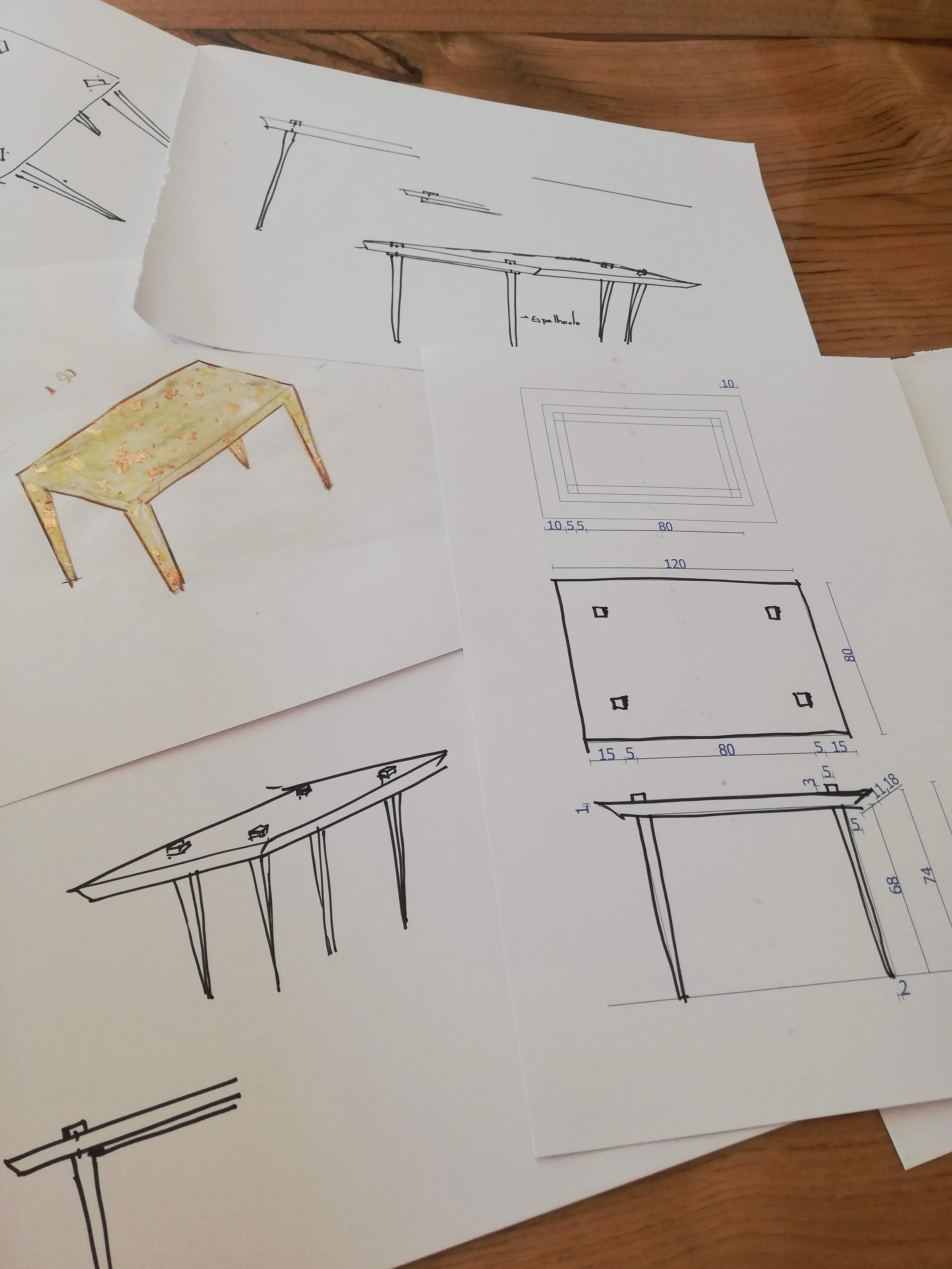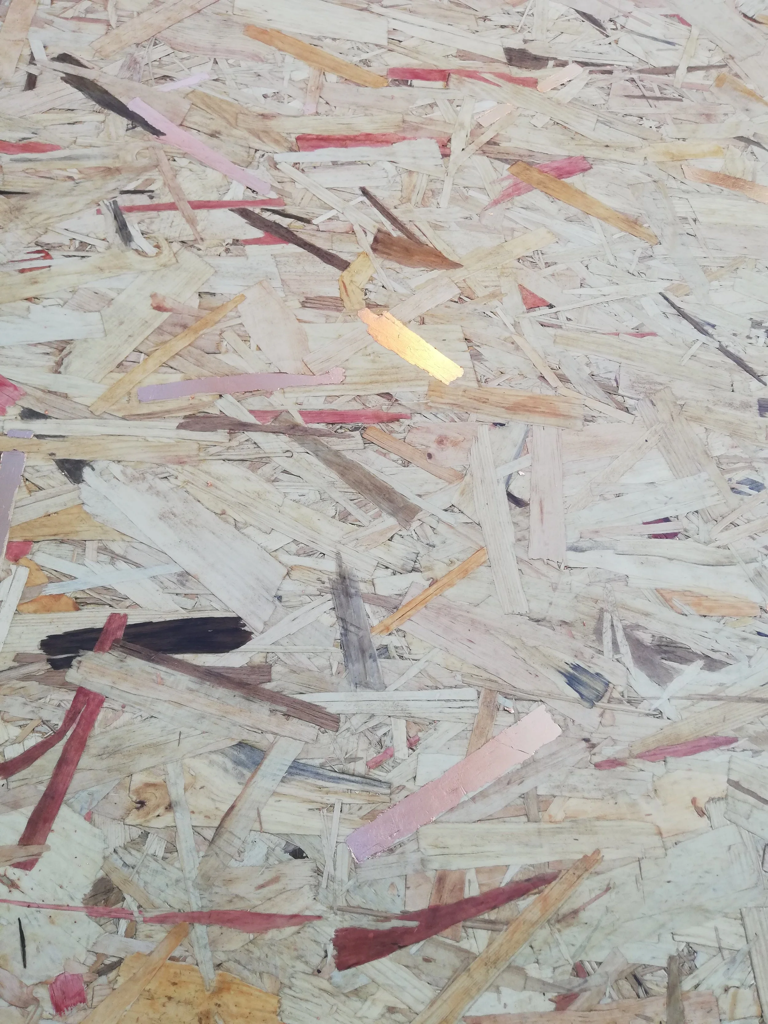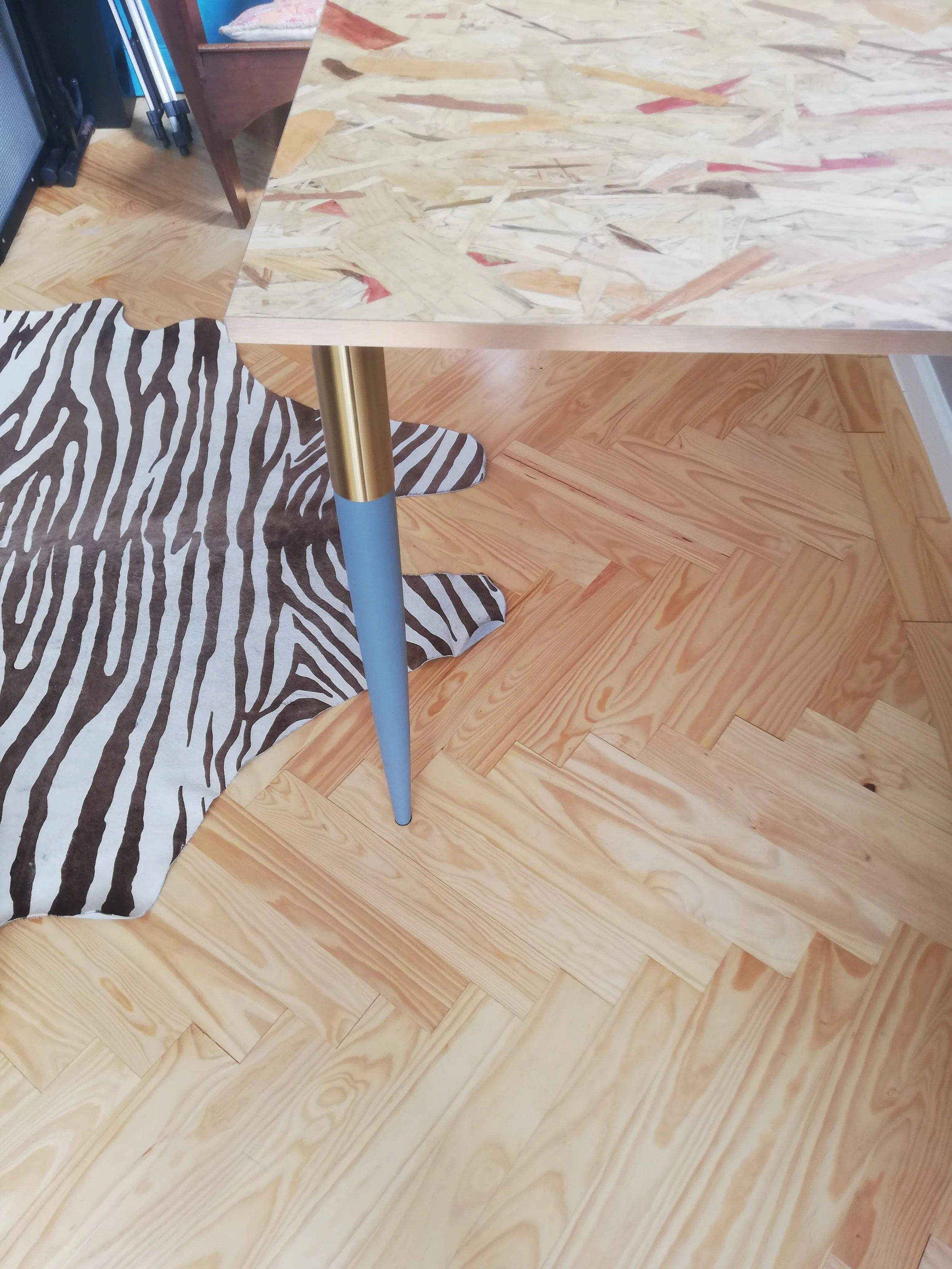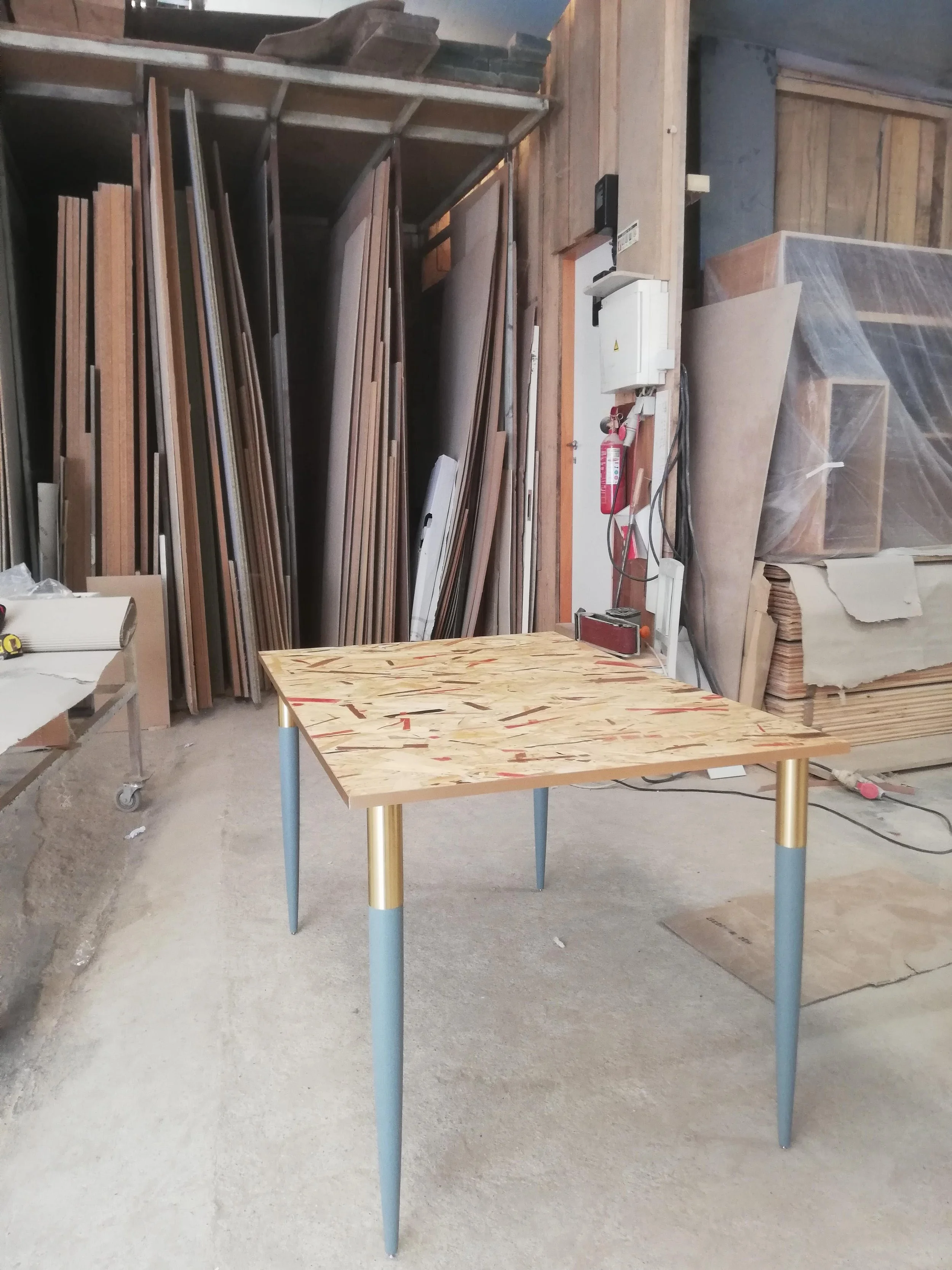 Materiais: tampo OSB pintado com velatura e folha de cobre.